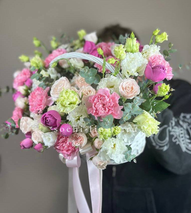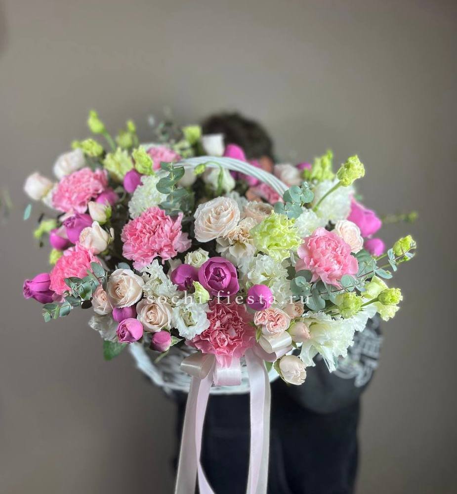 цветочная корзина с розами, мисти баблс, диантусами и гортензией.