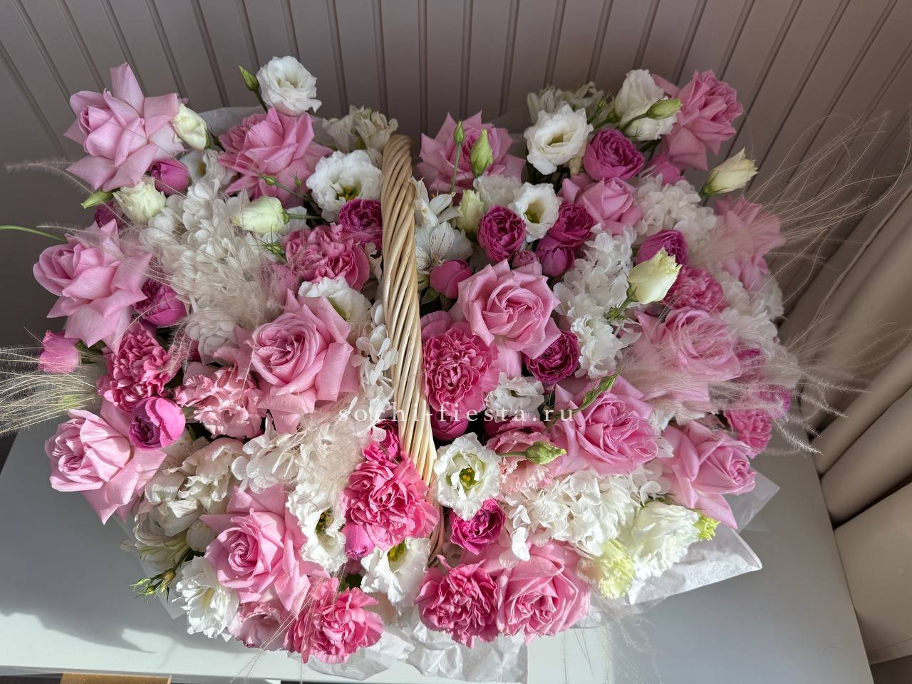 Корзина объединяет садовые розы с воздушной эустомой и яркими вспышками альстромерии. Ковыль добавляет лёгкости, а гортензия создаёт фактурный фон для всей композиции.