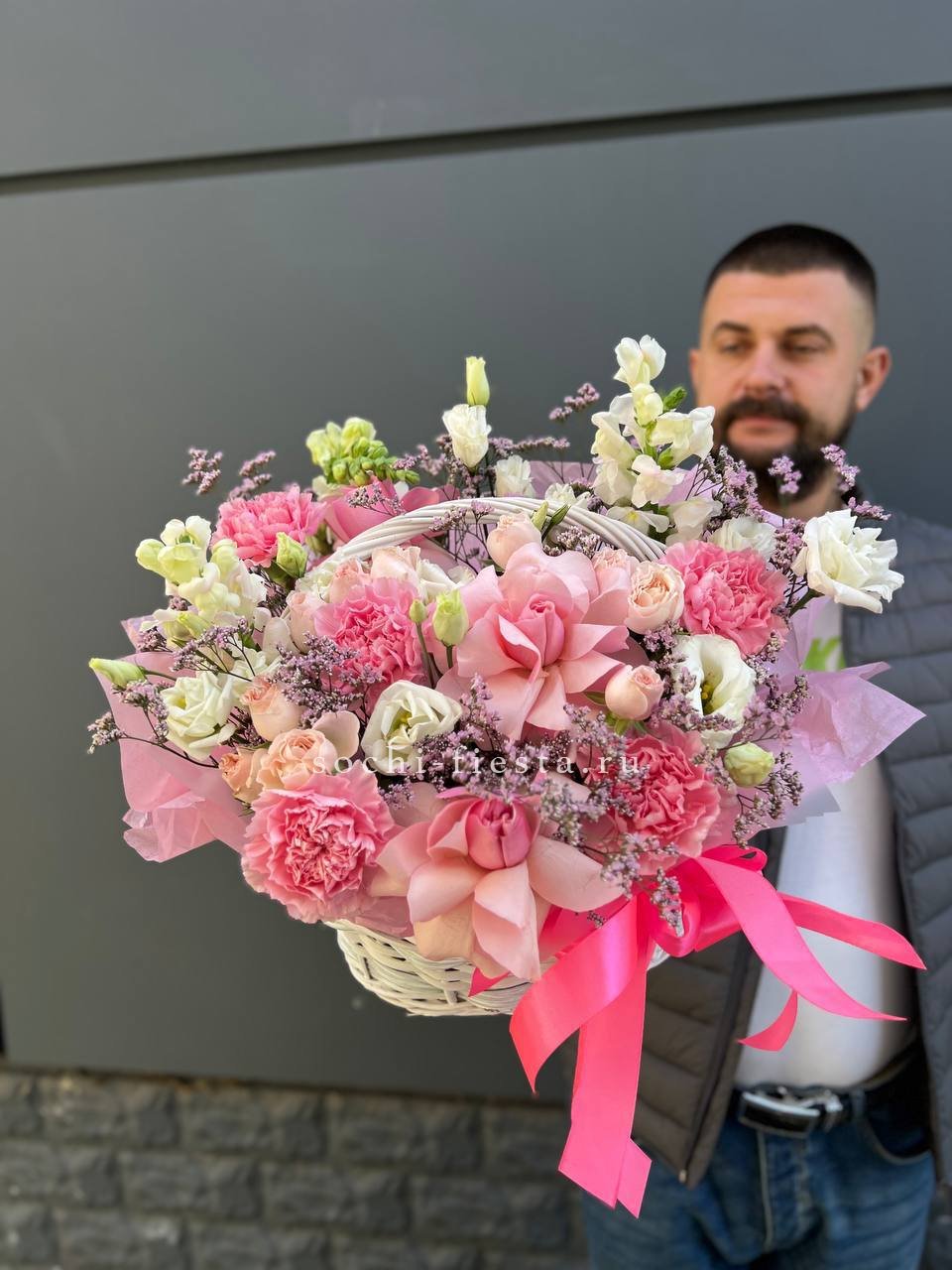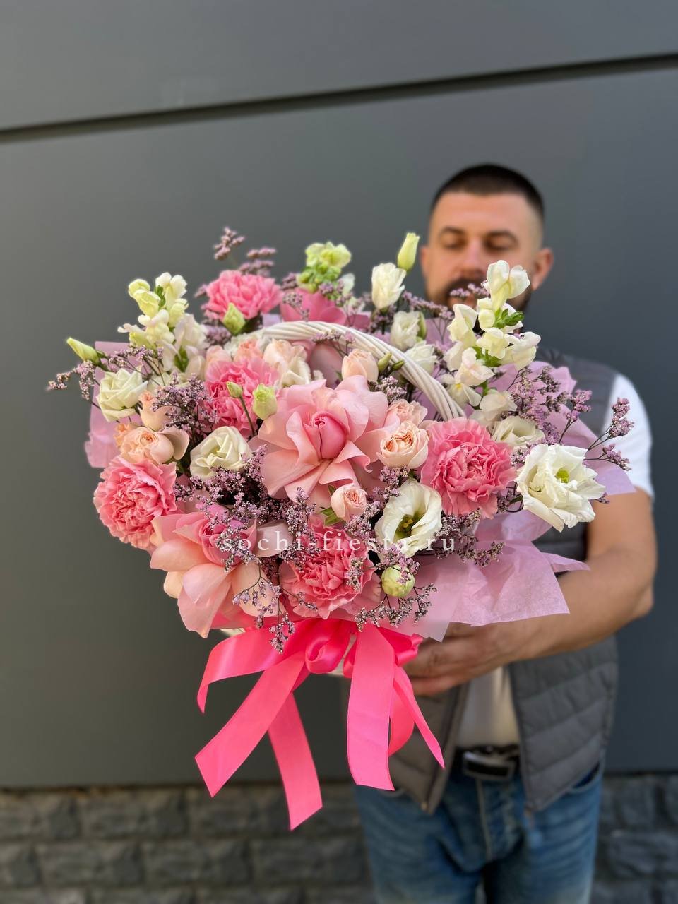 Белые розы и эустома образуют воздушную композицию с мягкими переходами между соцветиями. Хризантемы и маттиола добавляют объема, а гипсофила создает легкую дымку по краям. Корзина выглядит свежо и собранно в любом пространстве.