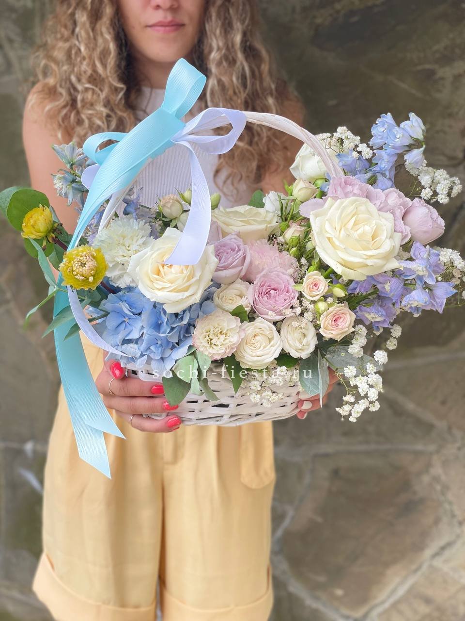 гортензии, пионы, лента, светлая корзина D30.