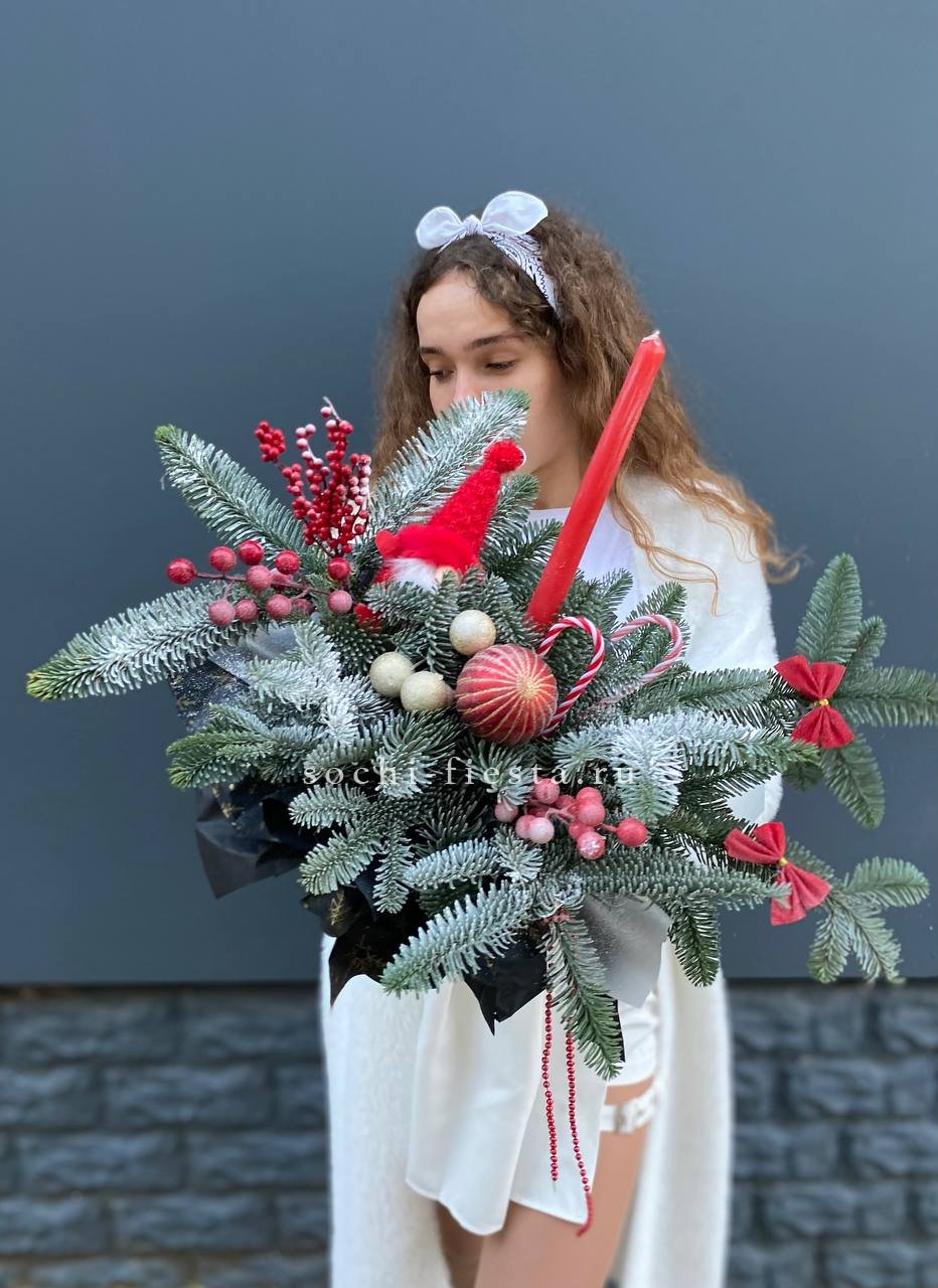 Бокал становится основой для композиции, где нобилис и праздничные игрушки образуют плотную структуру. Свечи завершают форму, а красный тон задаёт яркое звучание всему решению.