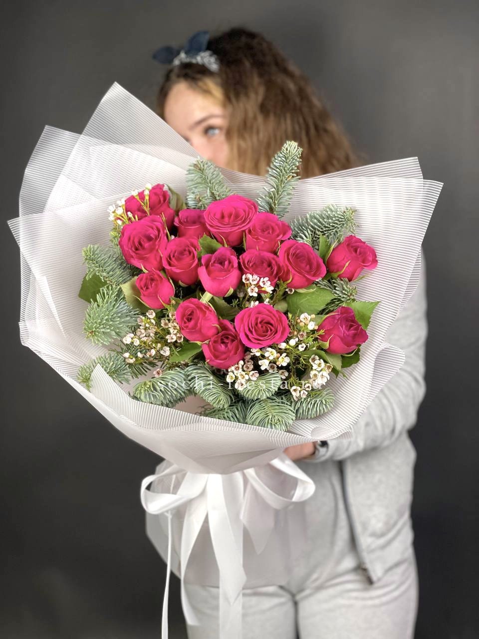 Пятнадцать роз встречаются с веточками нобилиса в плотном зимнем миксе. Хамелациум добавляет воздушности между бутонами и хвоей. Яркий праздничный акцент для дома или в дар.