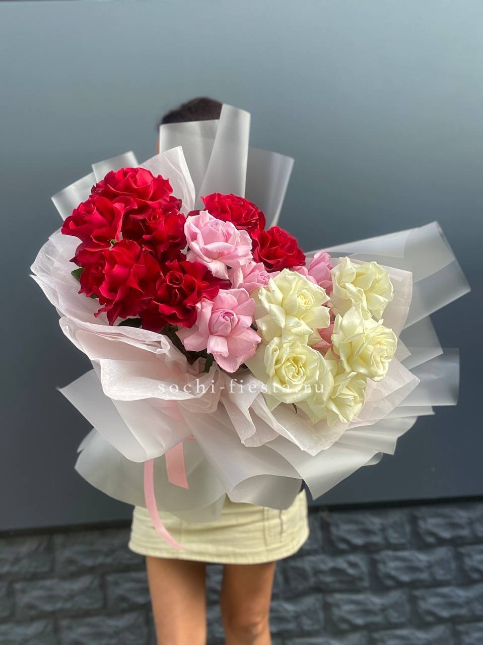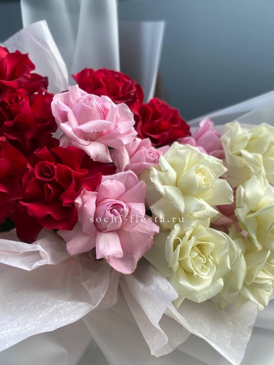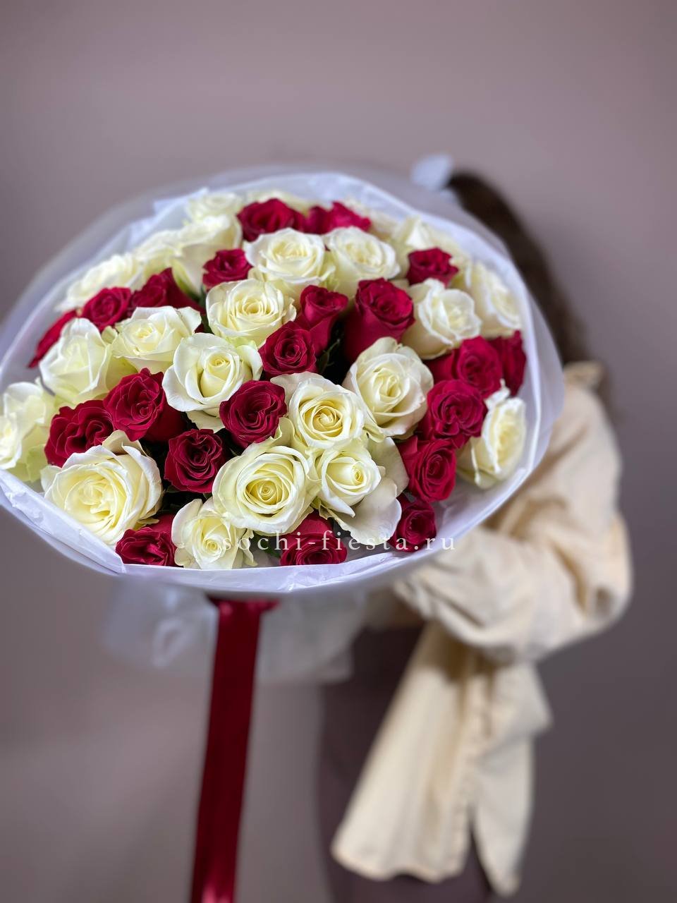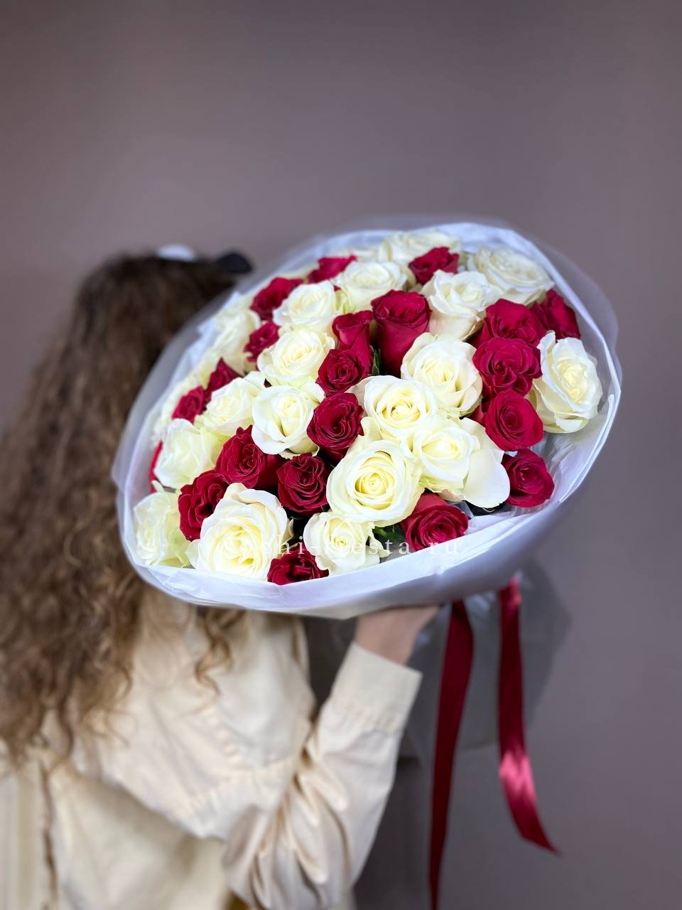 Мягкая игра оттенков между белым и розовым создает объемную глубину букета. Пятьдесят один бутон выстраивается в плотную структуру, где каждый цвет усиливает звучание соседнего без резких границ.