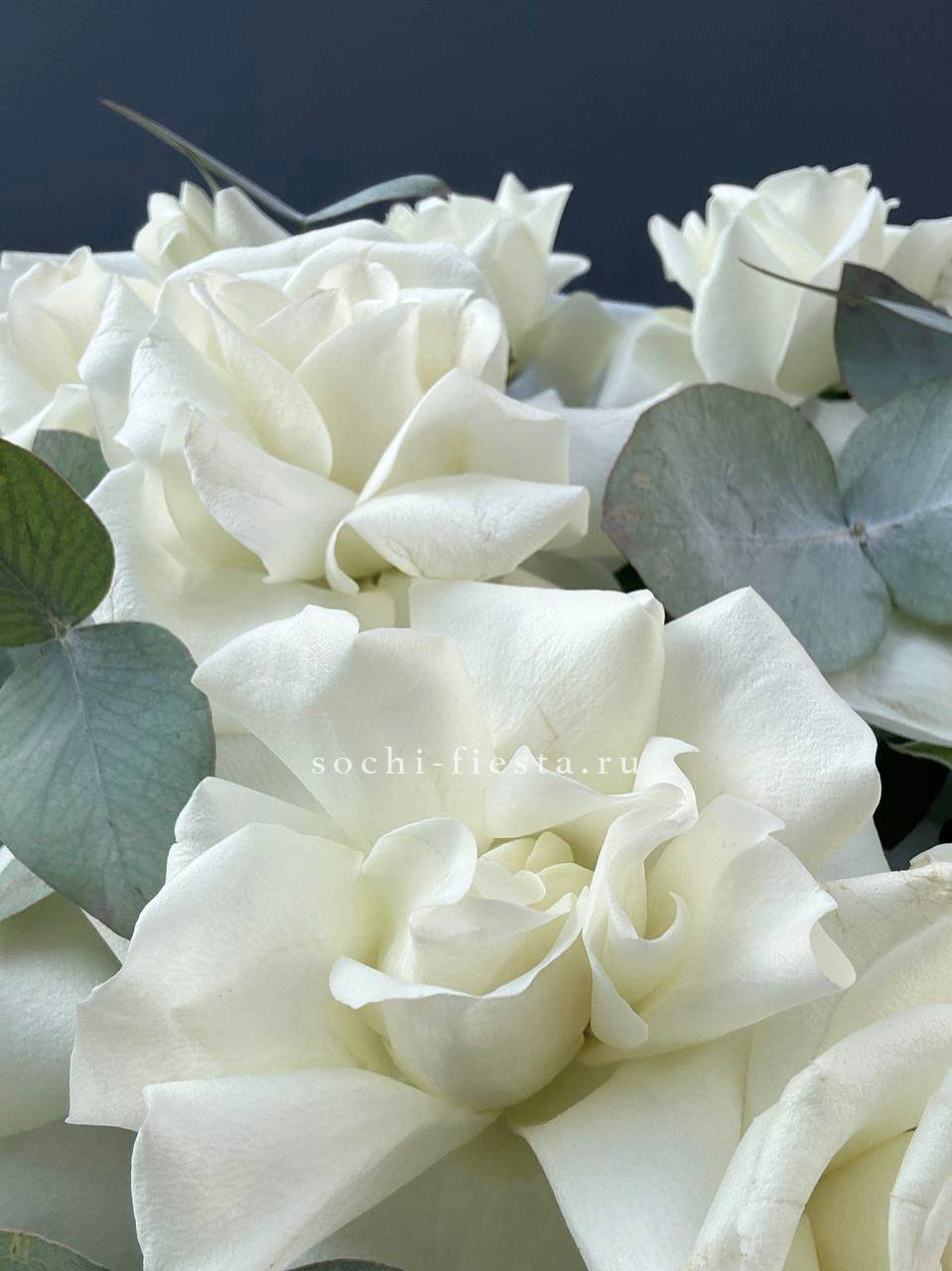Французские розы Notte Bianca раскрываются широкими вывернутыми бутонами с фактурной глубиной. Эвкалипт добавляет графичности и подчёркивает архитектуру каждого цветка.