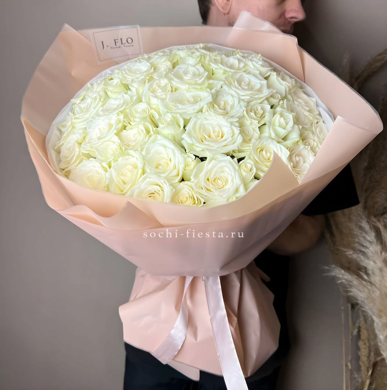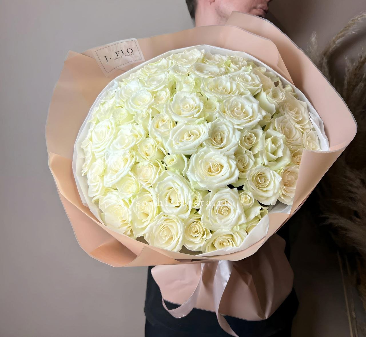 Тридцать один белый бутон формирует внушительную композицию, которая привлекает внимание своим присутствием. Букет выглядит цельно и заполняет собой любое пространство.