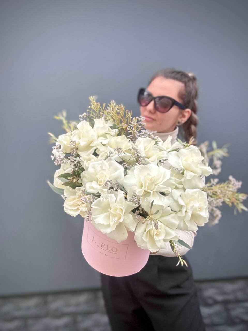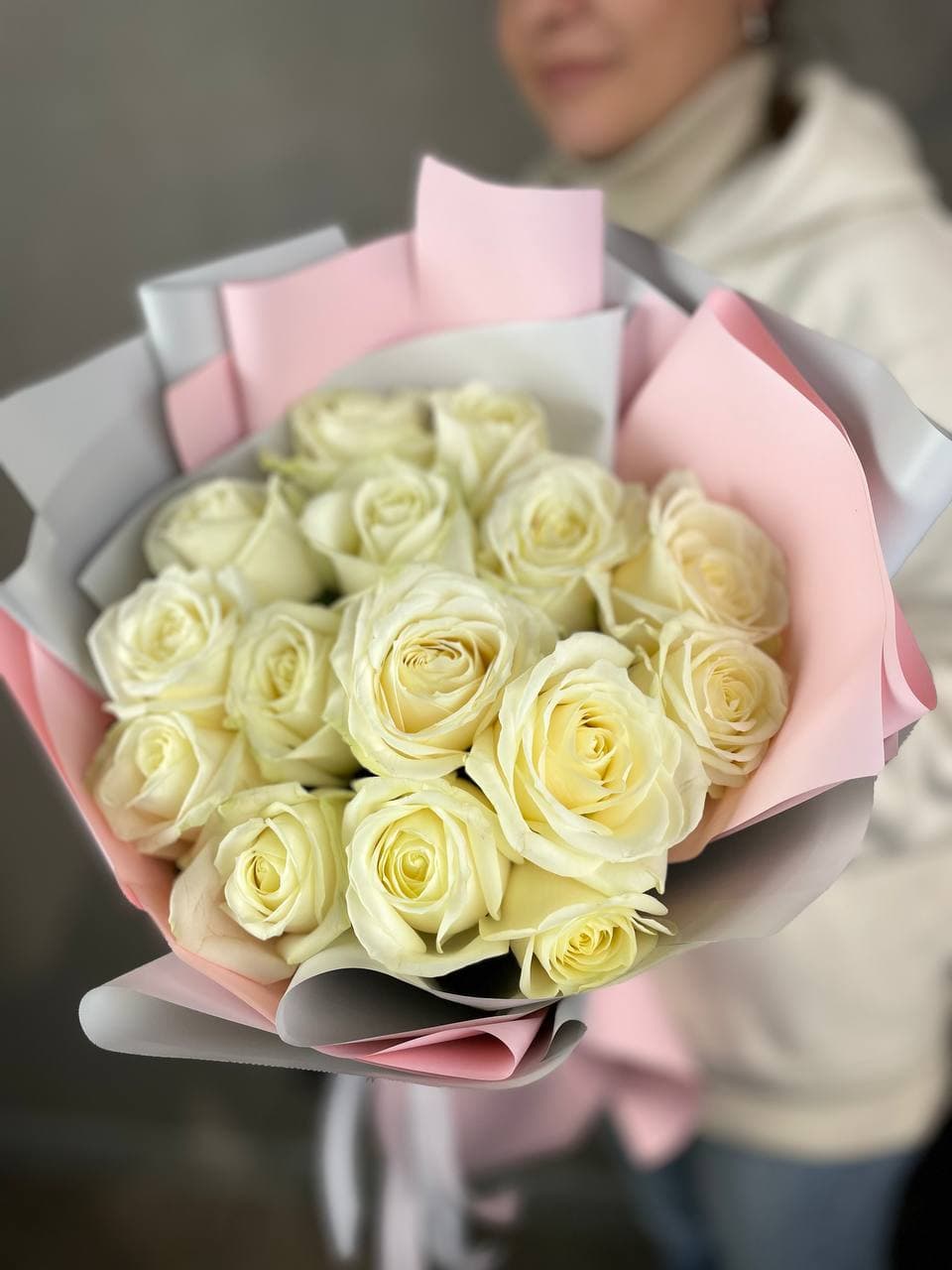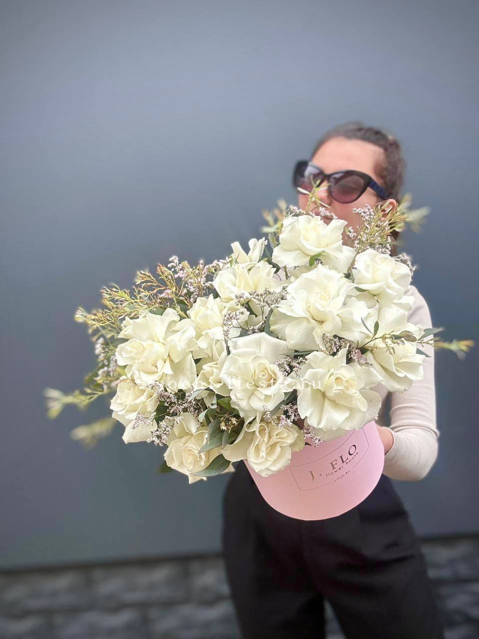 Белые розы собраны в плотную округлую форму с ровным силуэтом. Дизайнерская упаковка подчёркивает графичность линий и создаёт завершённую композицию. Букет с выразительным присутствием.