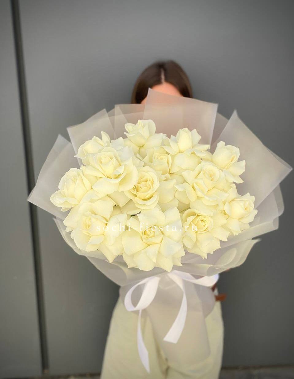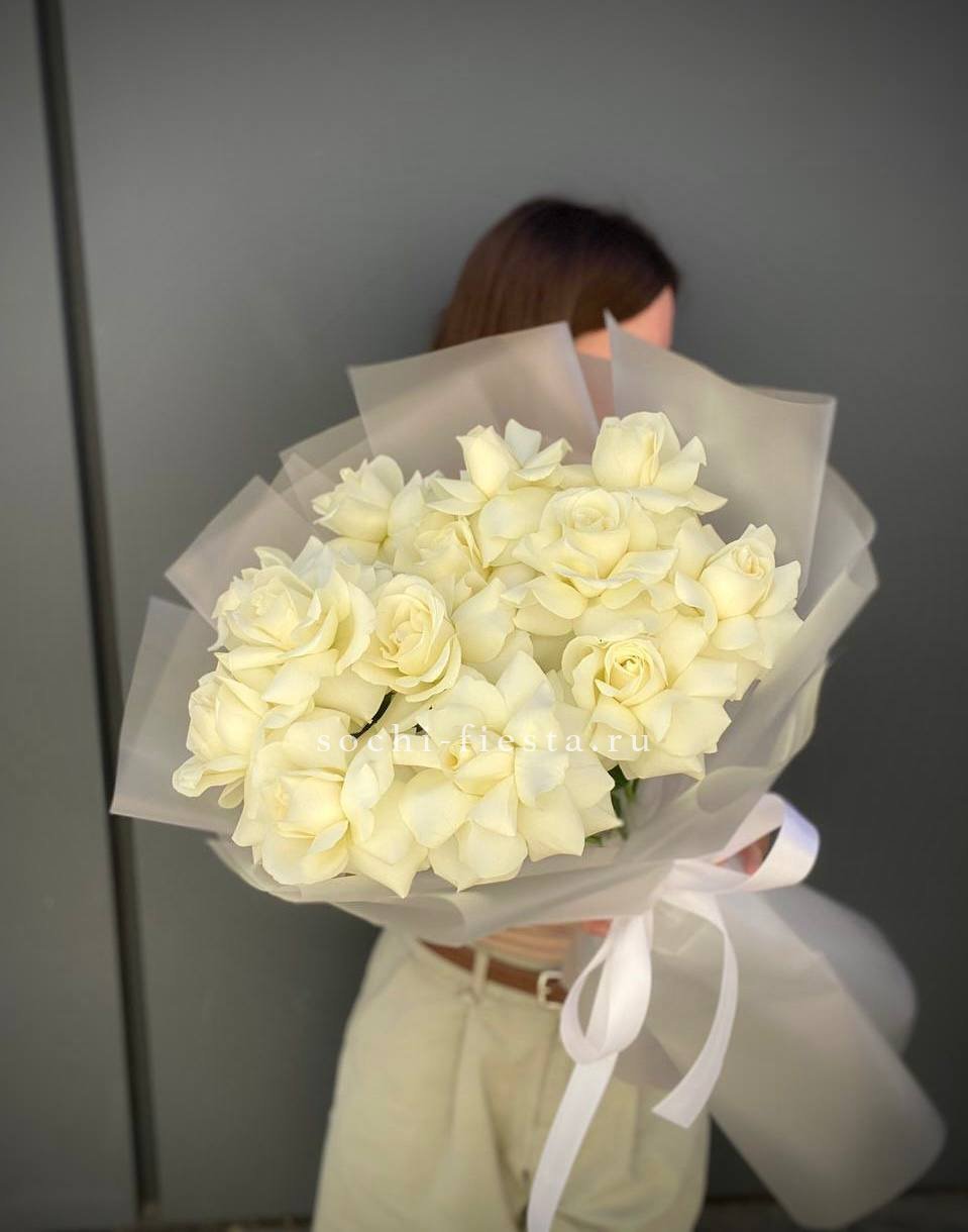 Пятнадцать белых роз собраны в плотный букет с чистыми линиями. Прозрачная упаковка сохраняет свежесть и открывает естественную красоту бутонов.