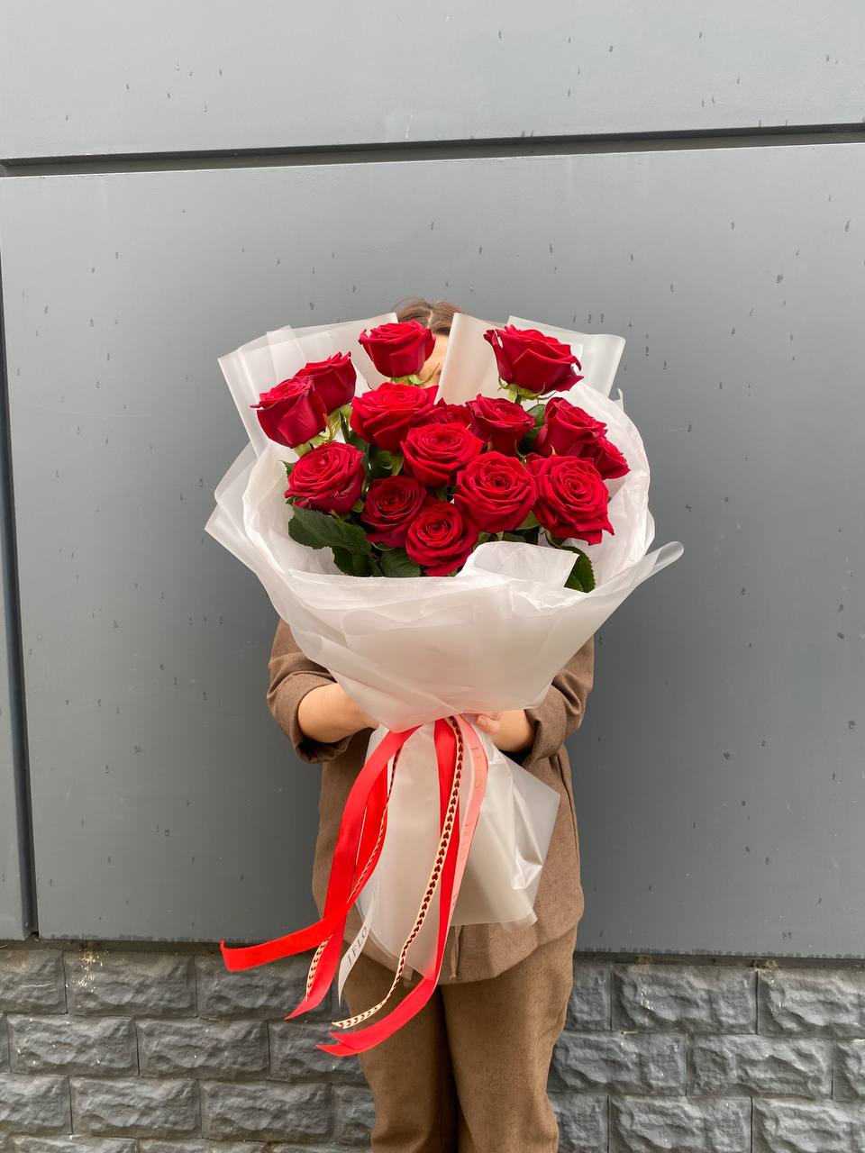 Пятнадцать красных роз в лаконичной упаковке держат безупречную вертикаль и собраны так плотно, что линия букета остаётся чёткой и графичной. Форма читается с любого угла и не теряет выразительности даже в высоких вазах.