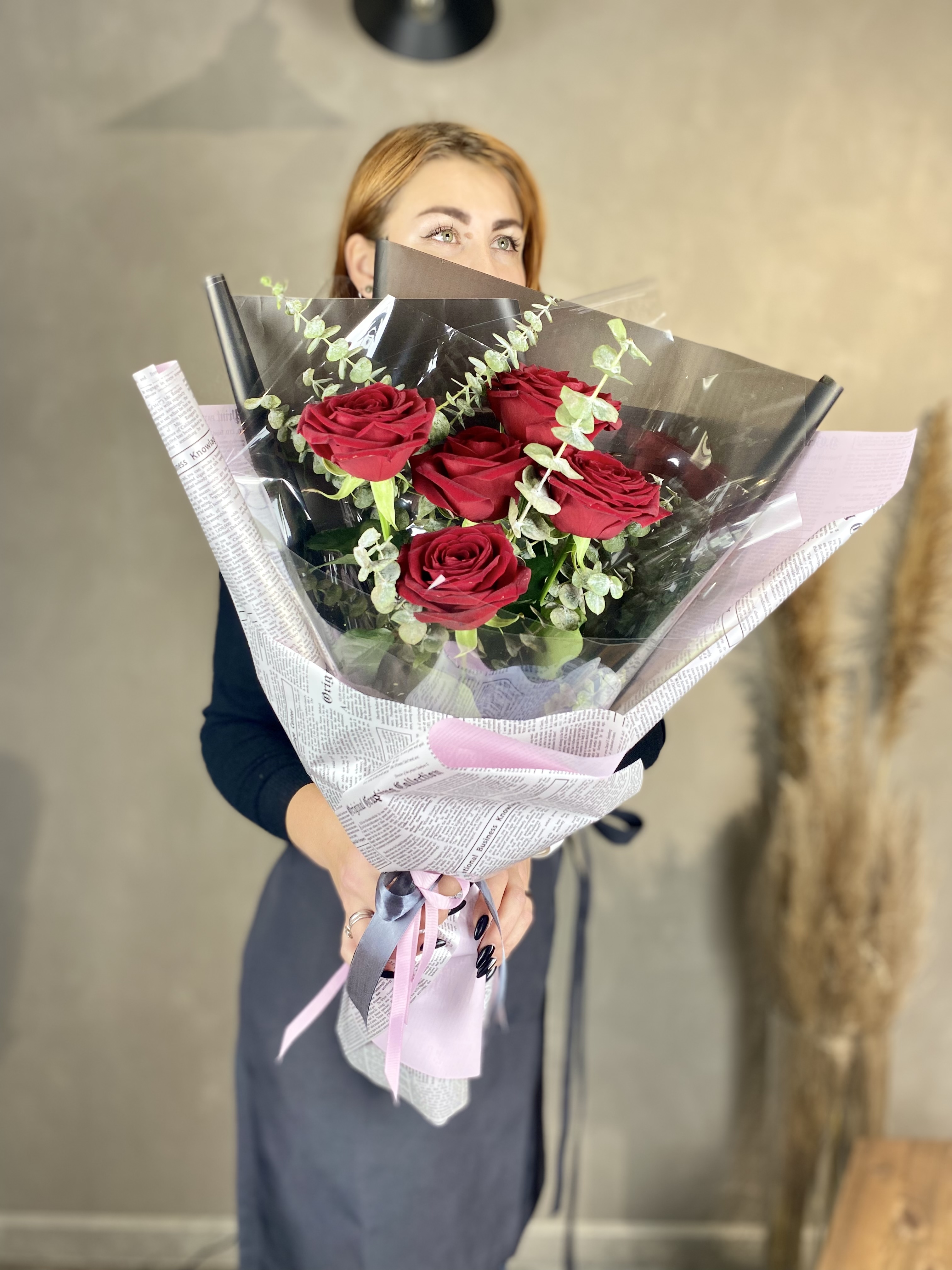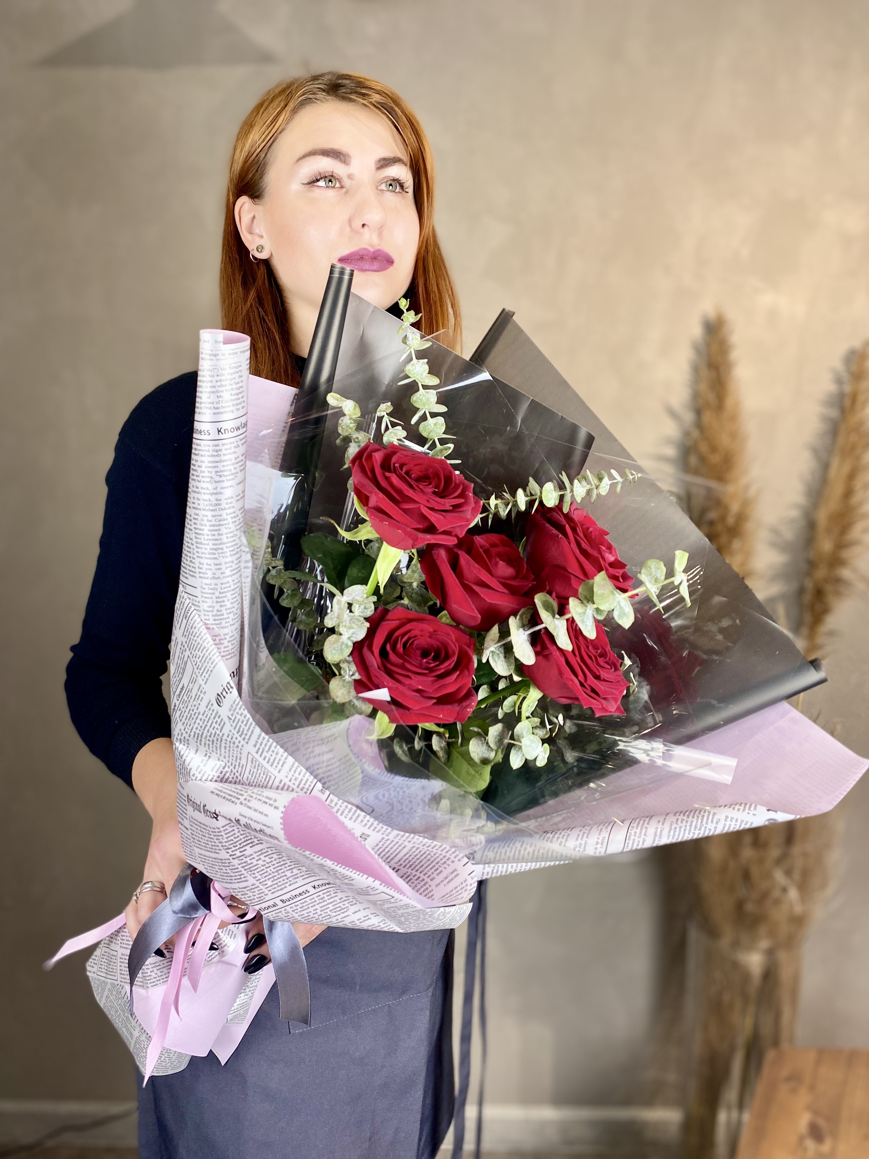 Французские розы с вывернутыми лепестками образуют пышную фактуру и глубину. Эвкалипт оттеняет насыщенность красного и придаёт букету свежесть.