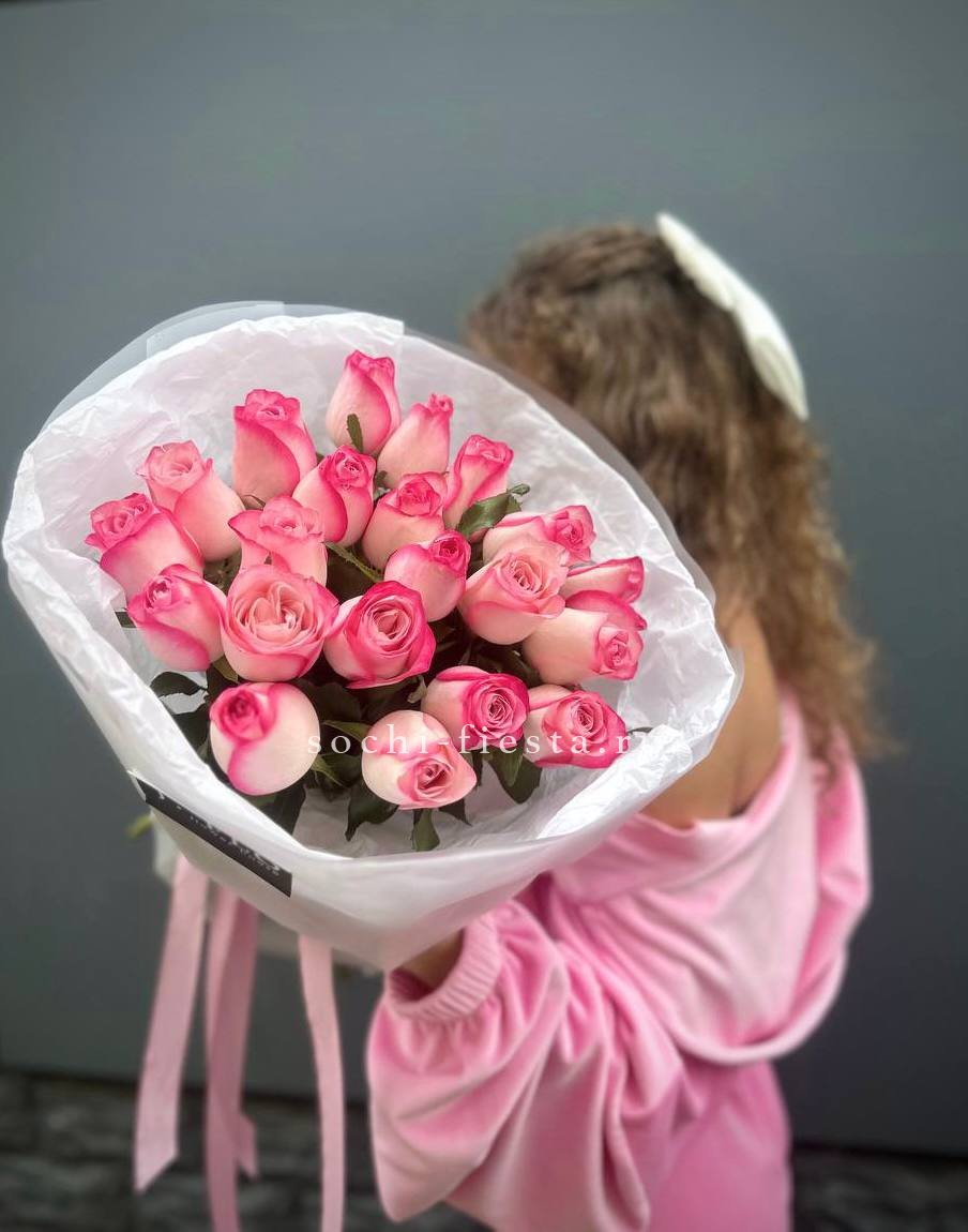 21 розовые розы, лента, дизайнерское оформление.