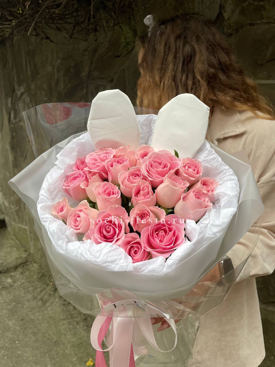 15 розовых роз, эвкалипт, дизайнерская упаковка.