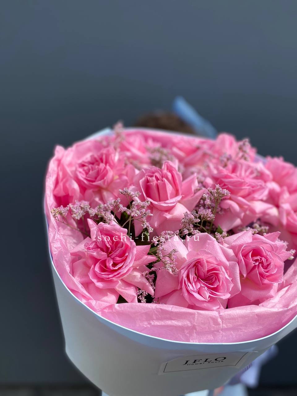 Двадцать один бутон собраны в плотную круглую форму и упакованы в белоснежную бумагу. Розовый оттенок лепестков мягко выделяется на светлом фоне, создавая спокойную гармонию без лишних деталей.