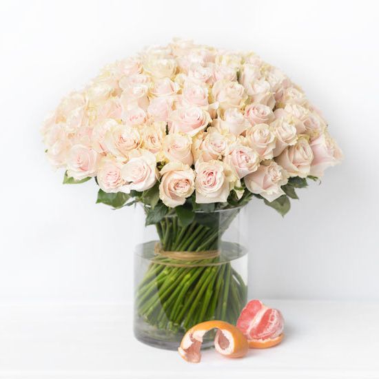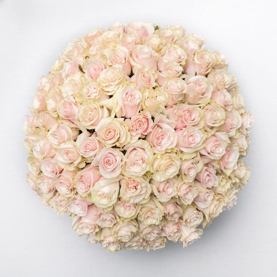 Сто одна роза в кремовых тонах — масштабная композиция с выразительным объемом. Букет наполняет пространство и создает запоминающееся визуальное присутствие.