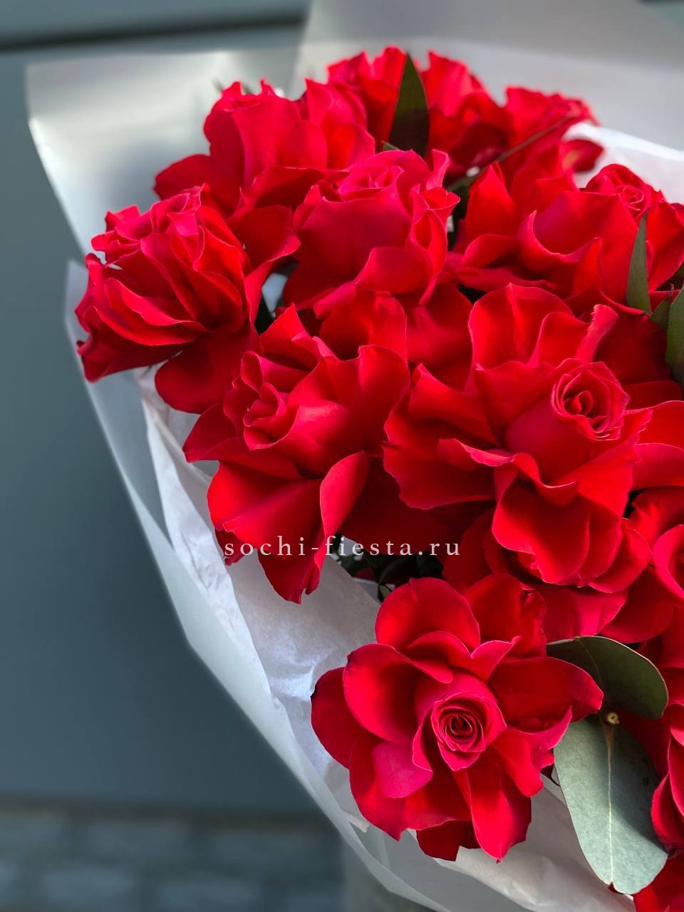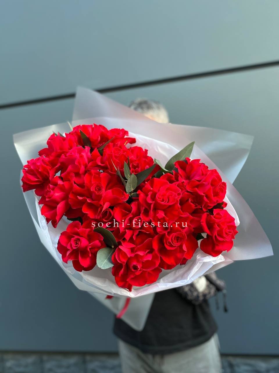 Глубокий красный тон распускающихся бутонов притягивает взгляд и удерживает внимание. Серебристая зелень эвкалипта создает прохладный фон для насыщенной палитры.