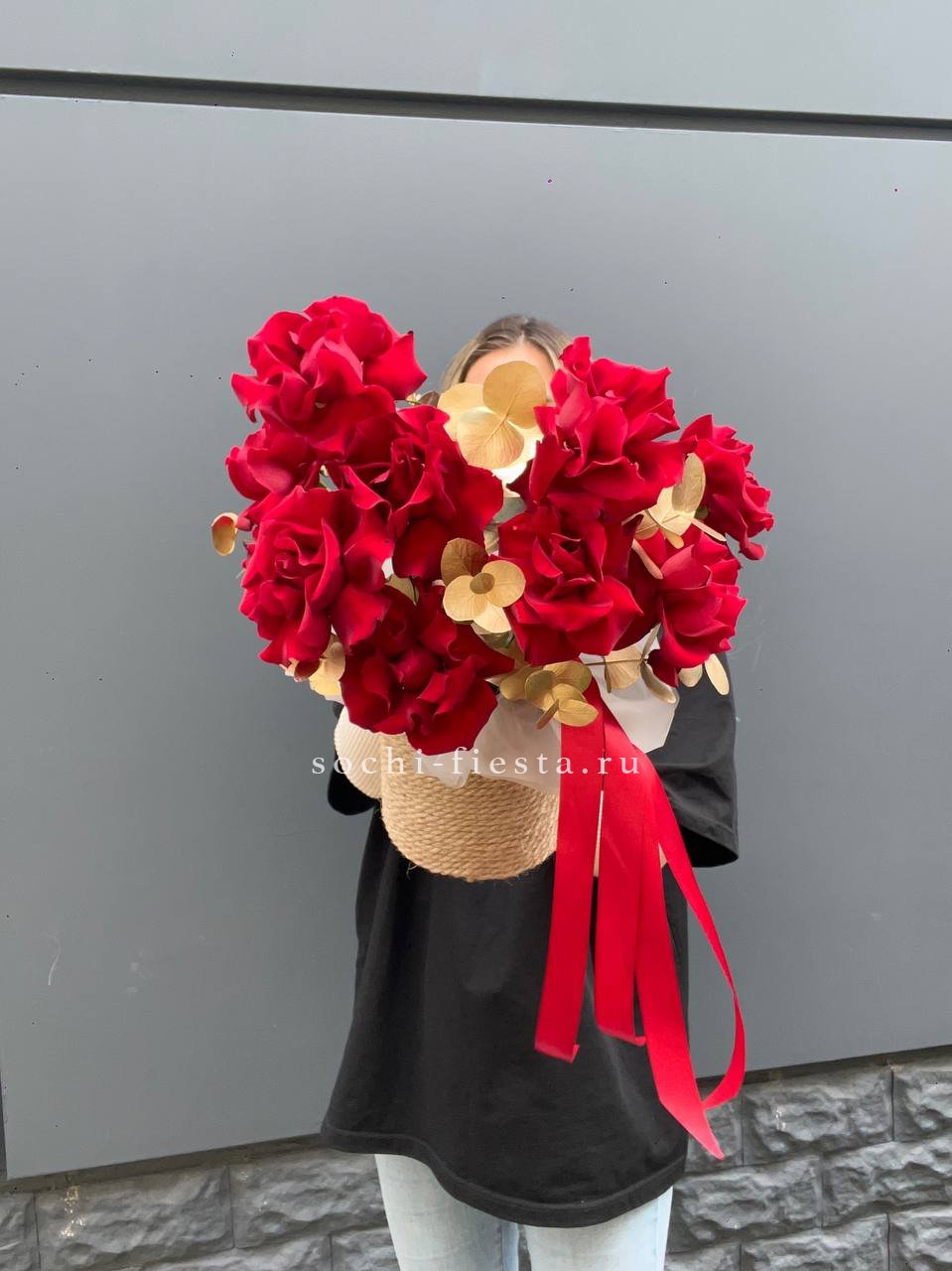 красные розы, эвкалипт, джутовое кашпо,  лента.