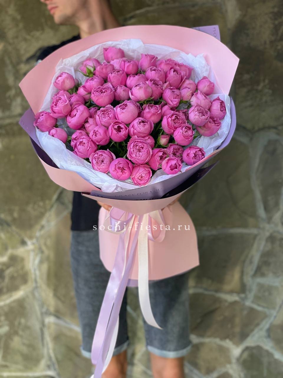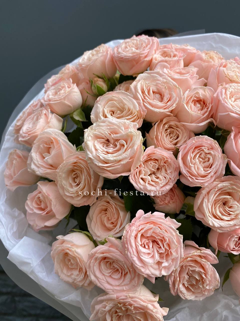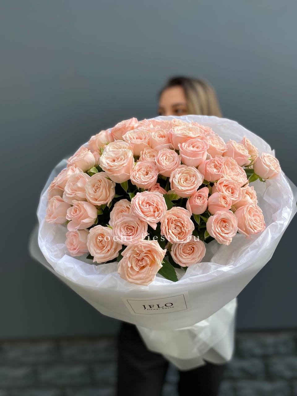 55 роз сорта Misty bubbles и bombastic, лента, дизайнерская упаковка.