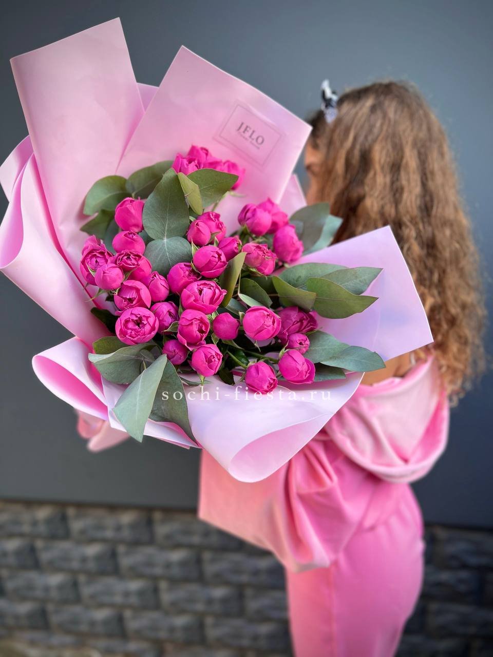 пионовидные розы кустовые мисти баблс в малиновом оформлении.