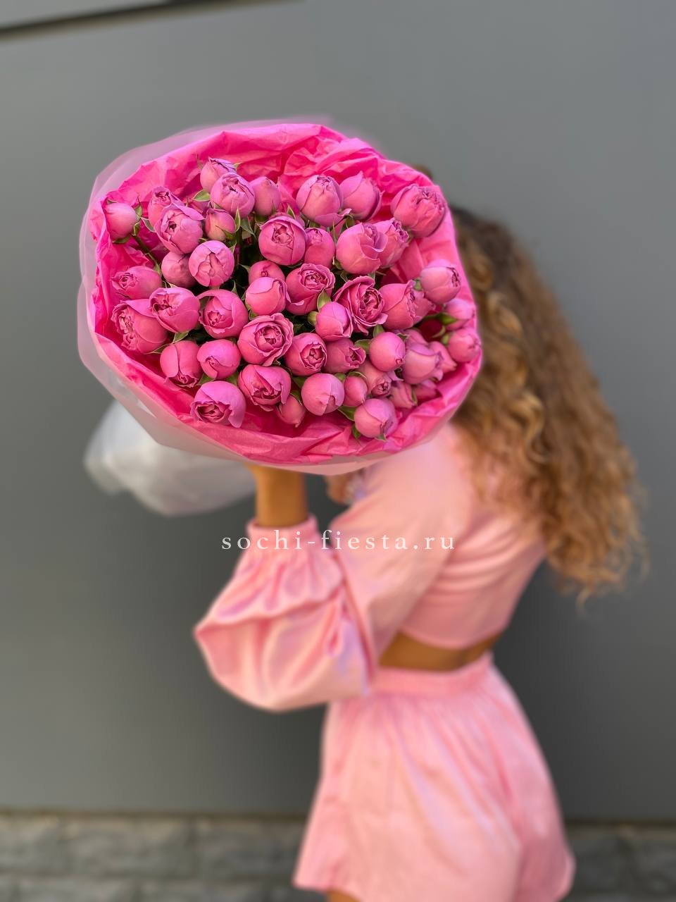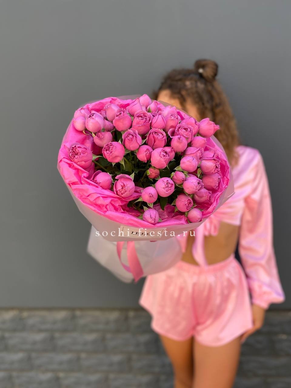 розы пионовидные 15 шт, эвкалипт, пленка, лента.