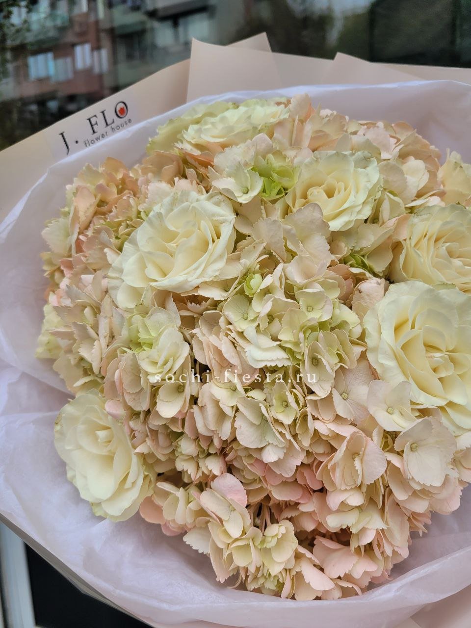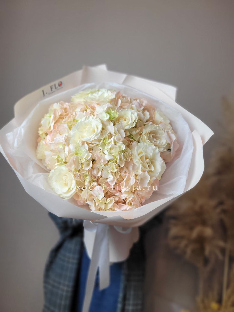 Герберы задают открытый характер букета, розы добавляют мягкости, а гортензия наполняет объёмом. Композиция смотрится свежо и держит форму без усилий.