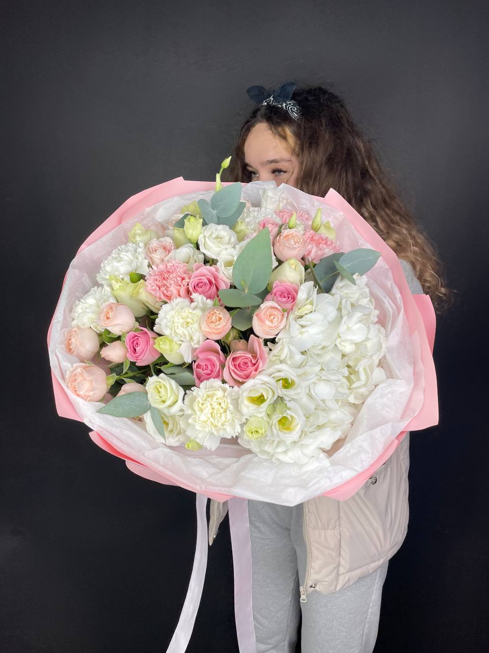 гортензия белая голландская, пионовидная роза Мисти Бабблс, оформление.