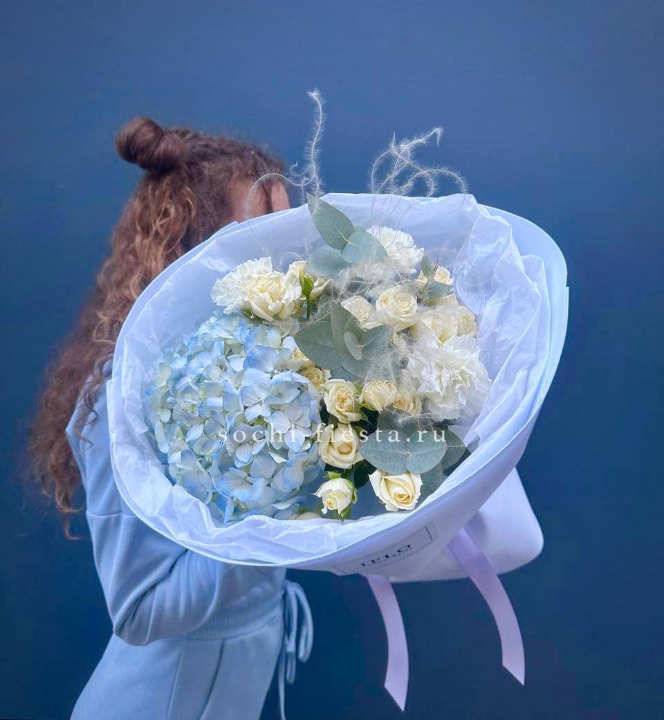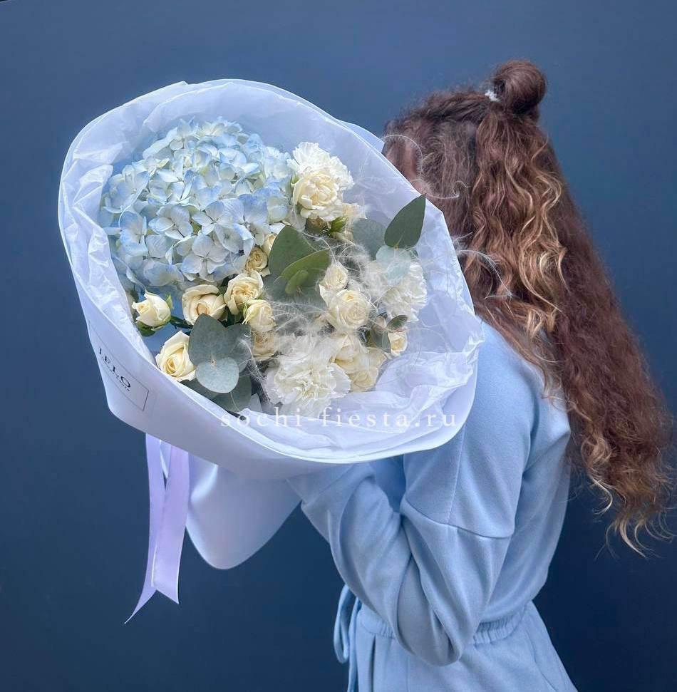 французские розы, маттиола, гортензии, эвкалипт, стифа, упаковка, лента.