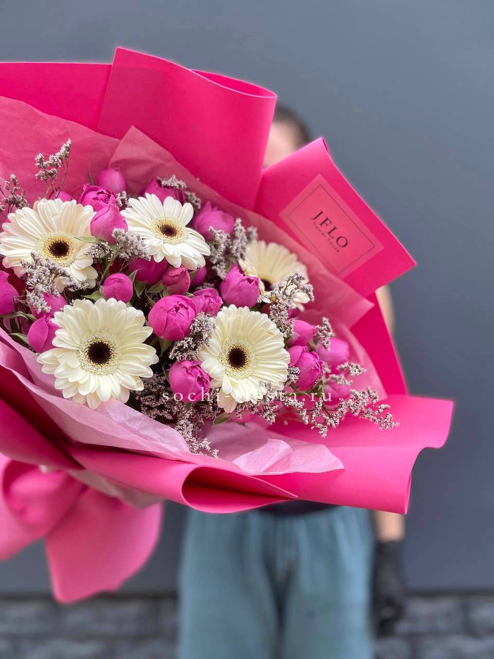 Сочные герберы рядом с пионовидными розами Мисти Бабблс образуют яркую композицию. Лимониум заполняет пространство между крупными бутонами и создает объем. Букет выглядит насыщенно и удерживает форму.