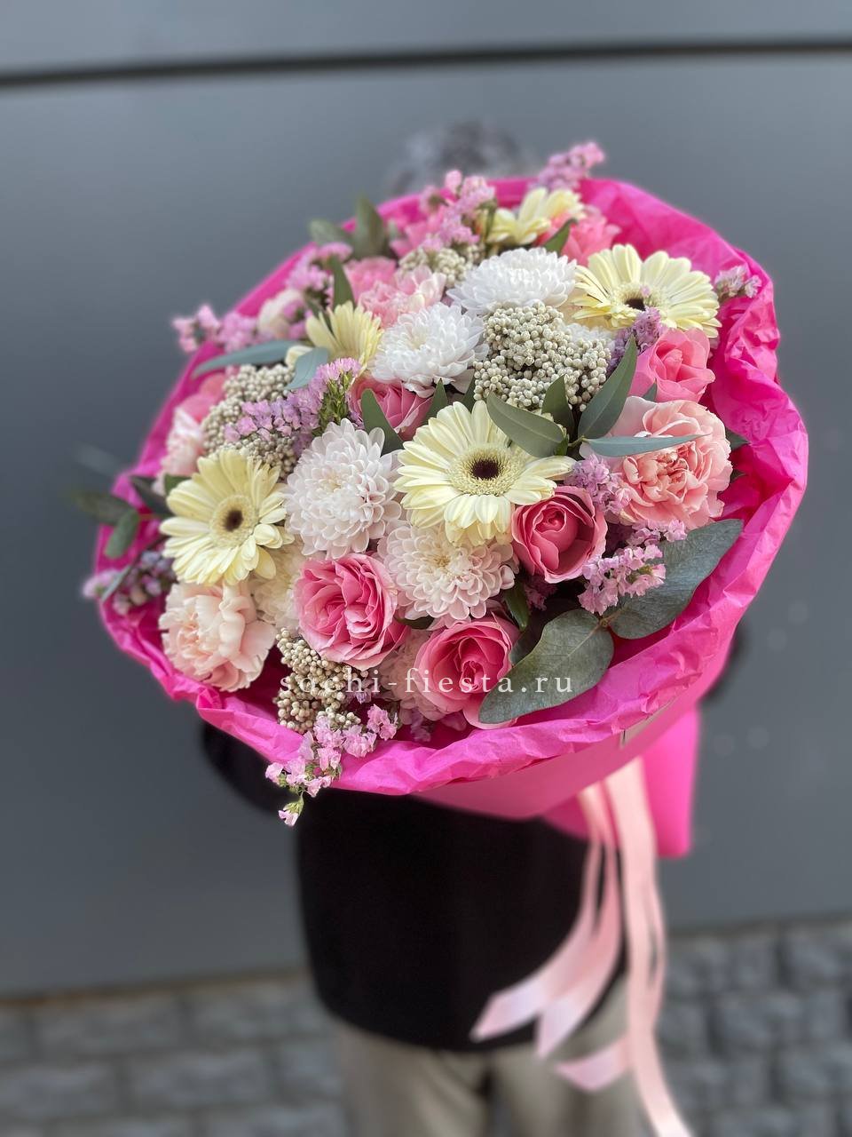 роза, хризантема, кустовая роза, эвкалипт, лента, упаковка.