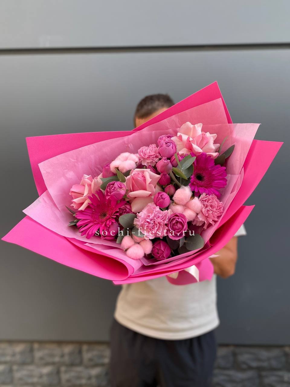 мисти баблс, розы, гербера, диантус, хлопок, упаковка.