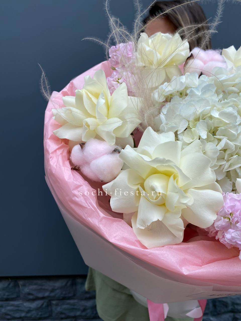 Воздушная композиция с крупными соцветиями гортензии и пышными розами создает ощущение легкости и объема. Эвкалипт добавляет свежести, а бомбастик расставляет яркие акценты между бутонами.