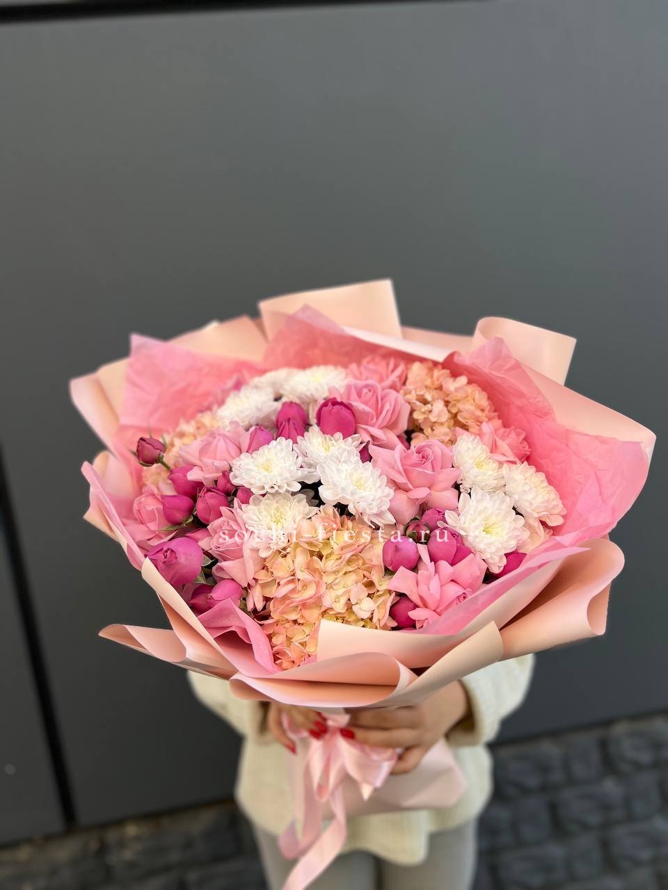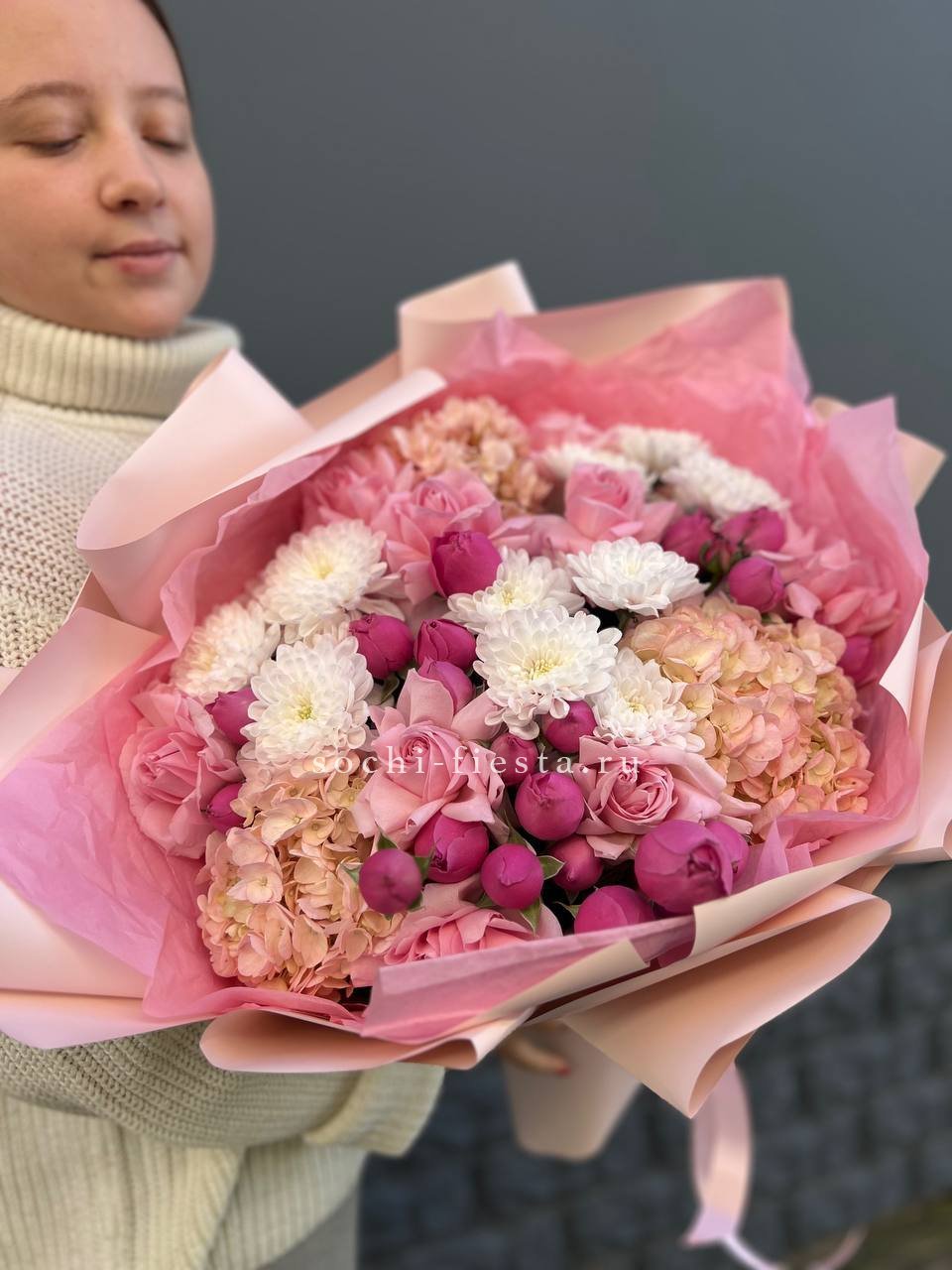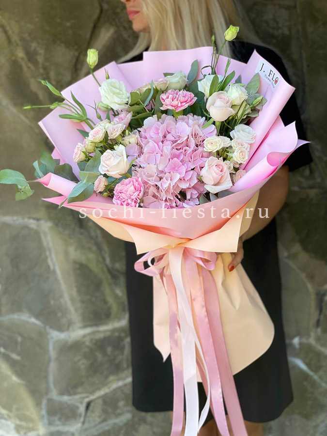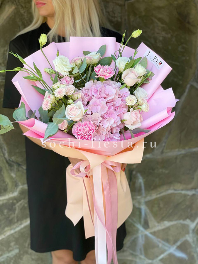 Воздушная композиция в пастельных тонах с пионовидными розами и гортензией создает объемную форму. Каждый бутон раскрывается слоями, а диантусы добавляют графичные точки среди крупных соцветий.