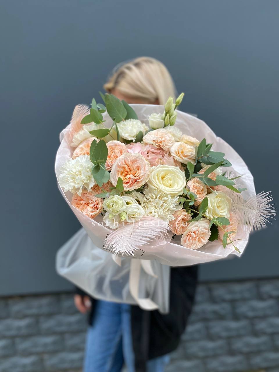 эвкалипт, гортензия, перо, кустовая роза, эустома, роза белая, диантус, упаковка.