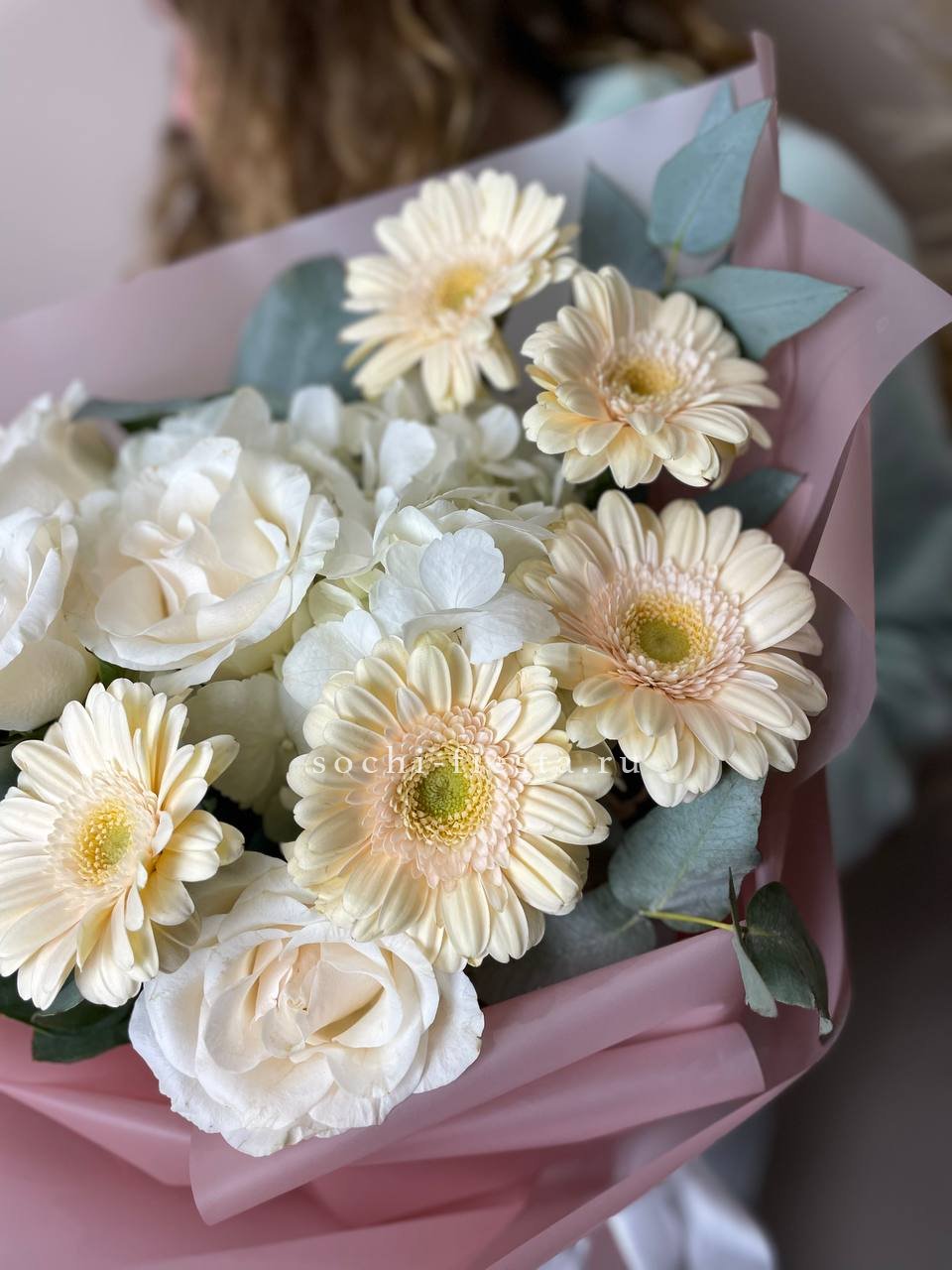 гортензия, пионовидная роза, озотамус, белая роза в нежном оформлении.
