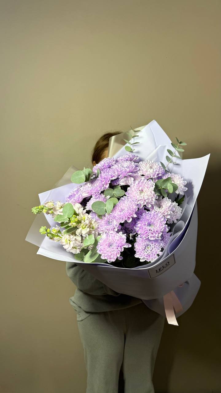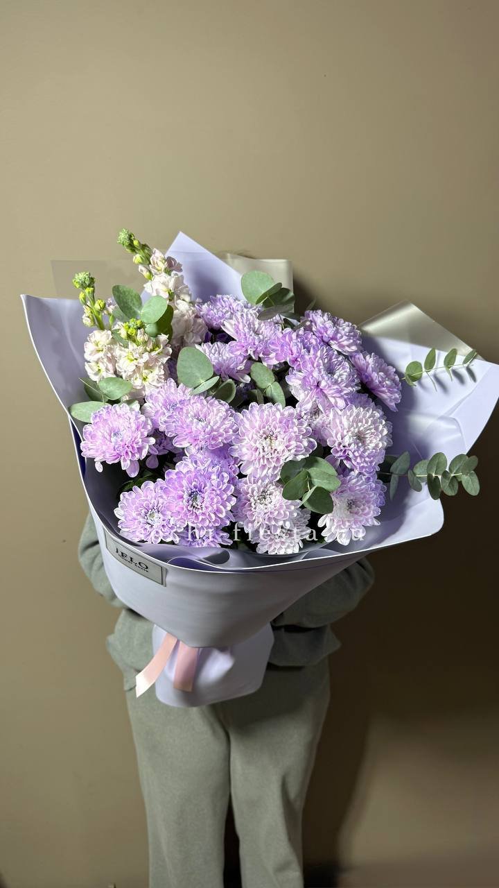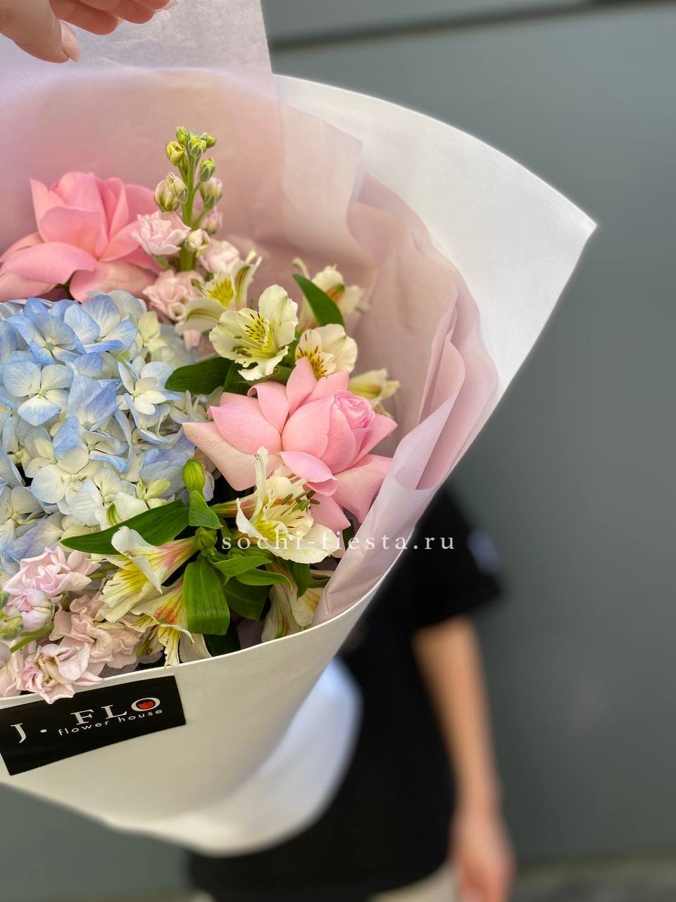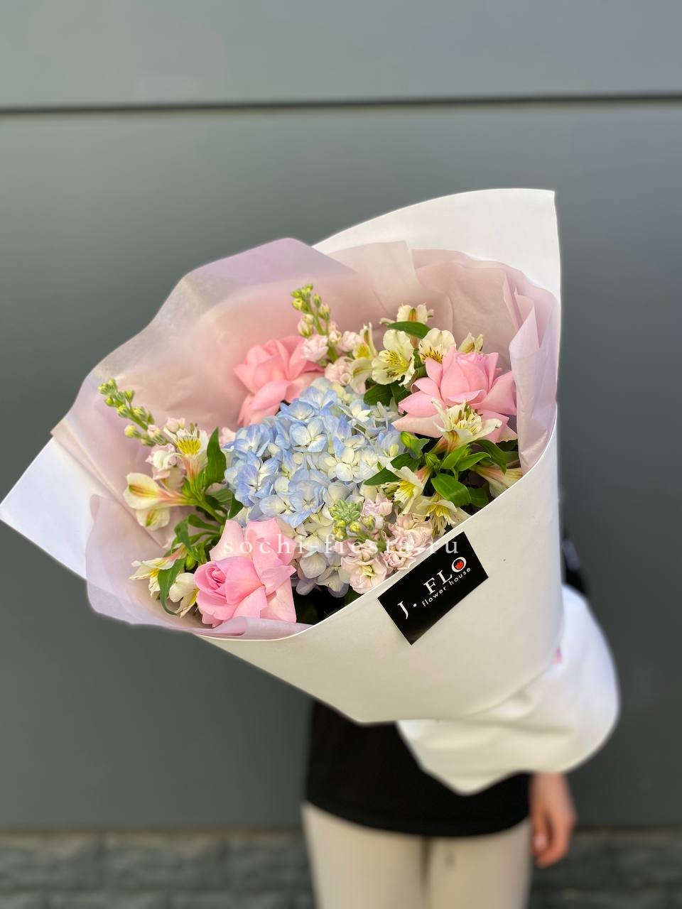 Плотная сборка с пышной гортензией в центре и рассыпчатыми соцветиями диантуса по краям. Эустома добавляет воздушности, а ветки озатамуса создают лёгкую графику. Букет держит форму и выглядит объёмно с любого ракурса.