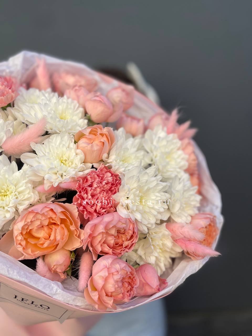 кустовые розы, хризантемы, диантусы, лагурус, лента и дизайнерская пленка.