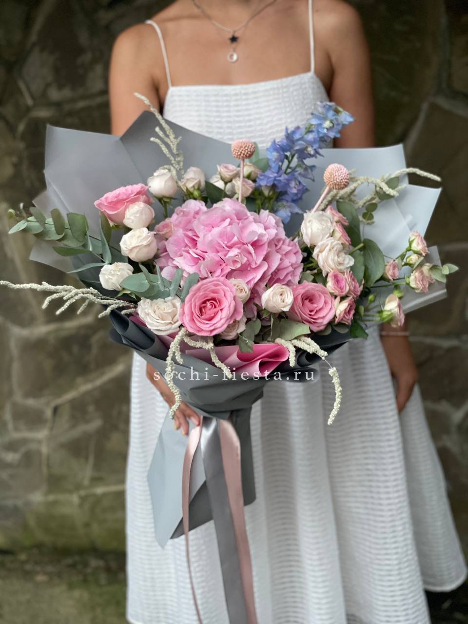 Диантусы и маттиола добавляют букету душистую лёгкость, а гортензия создаёт объёмную основу. Мисти баблс и эвкалипт рисуют воздушный контур вокруг розовых оттенков.