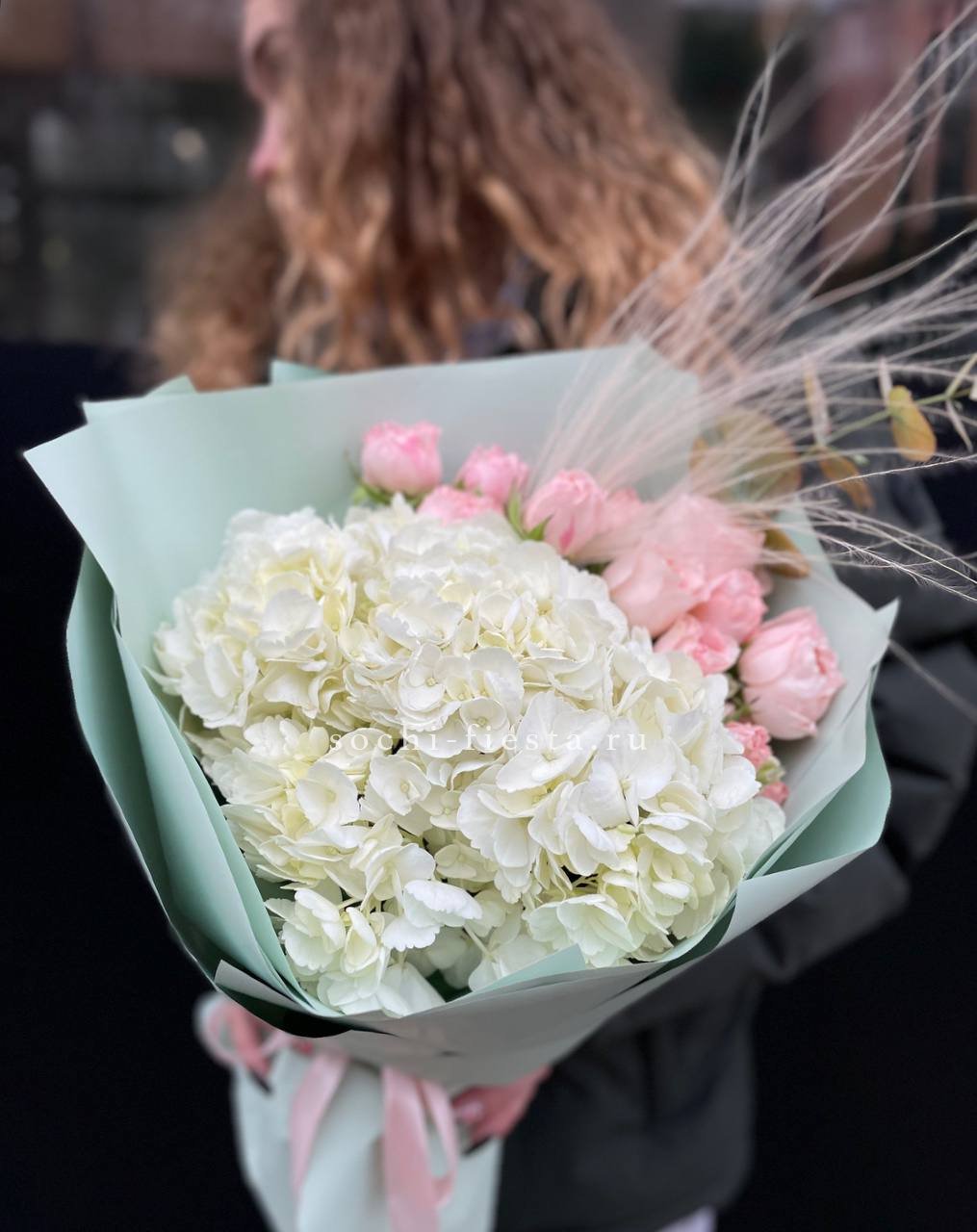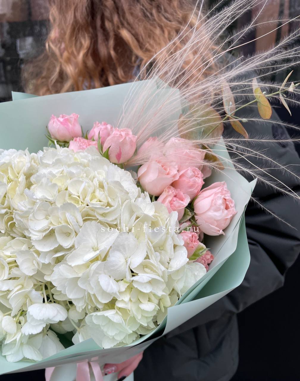 гортензия, пионовидные розы, эвкалипт, пампасная трава, лента, дизайнерская упаковка.
