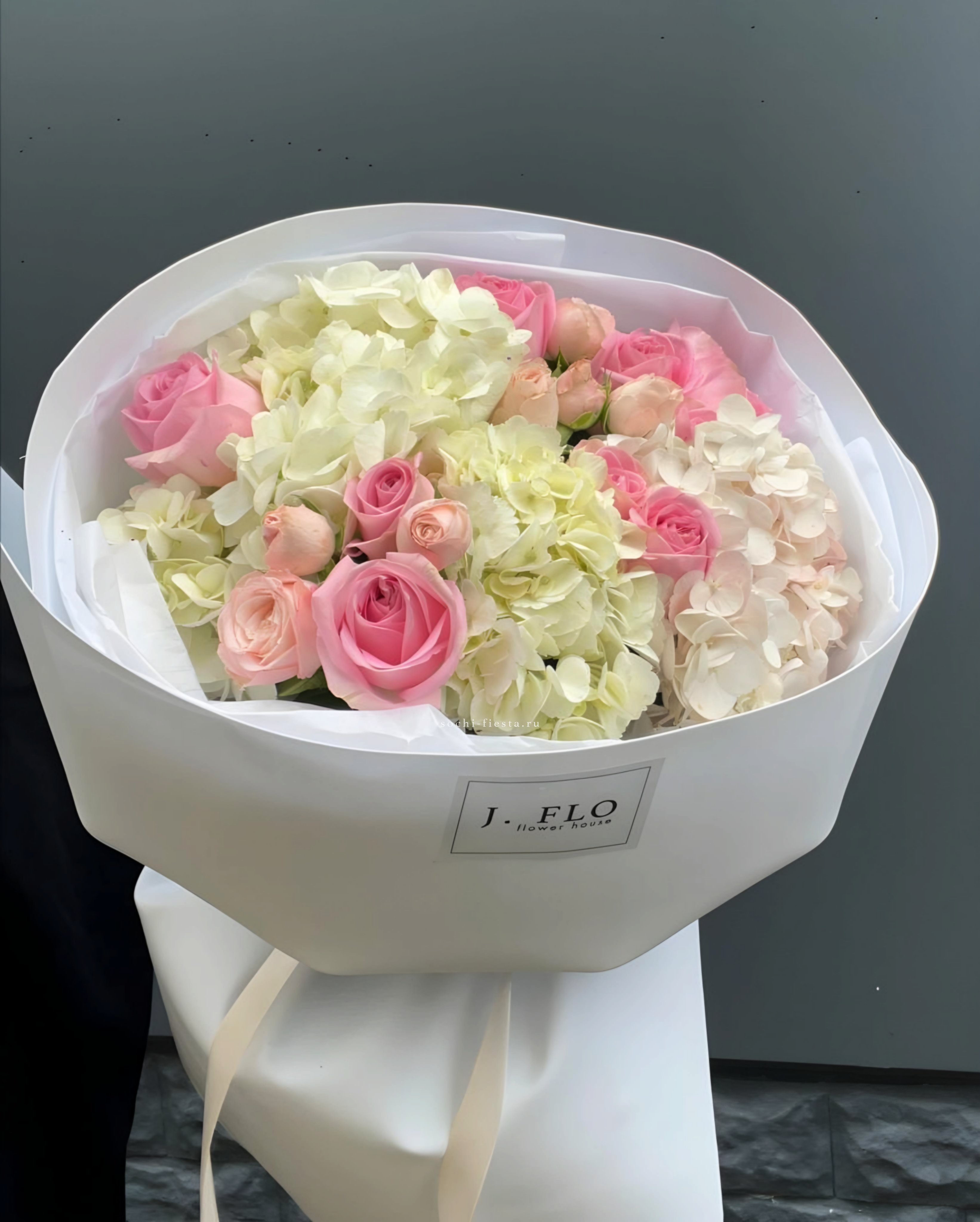 Диантусы и кустовые розы создают воздушную композицию с мягкими переходами оттенков. Бутоны распределены свободно, образуя естественный силуэт без жесткой геометрии. Букет хорошо держит форму и долго сохраняет свежесть.