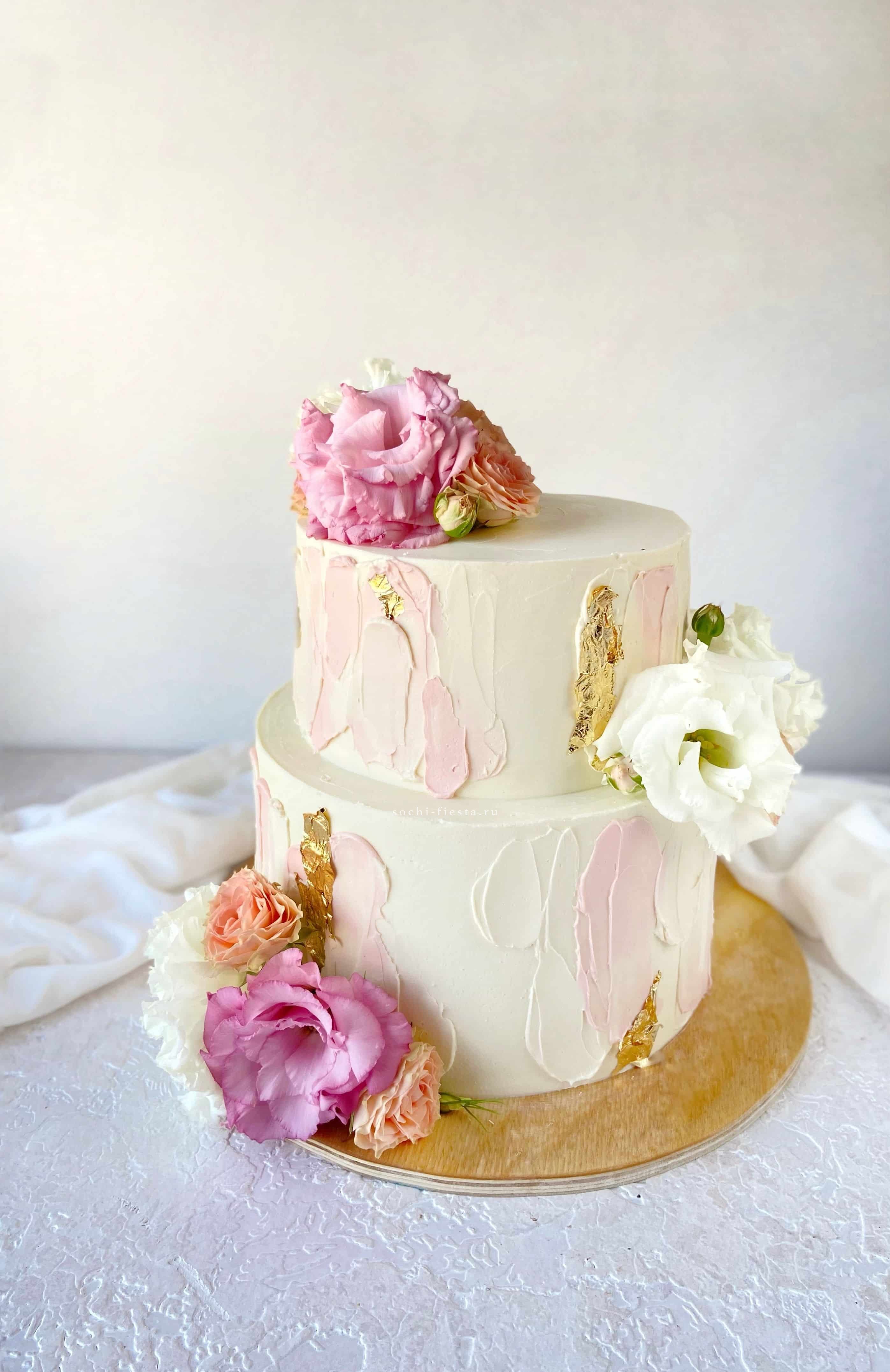 Три яруса создают выразительную вертикаль с градиентом от белого через лавандовый к глубокому фиолетовому. Каскад сахарных цветов добавляет движение и объем. Впечатляющее присутствие в пространстве.