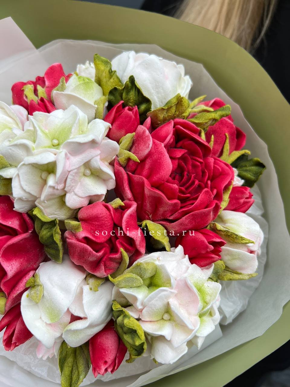 Букет из зефирных лепестков в насыщенных тонах собран на натуральных компонентах. Яркая палитра и воздушная текстура создают весёлое настроение без единого увядшего бутона.